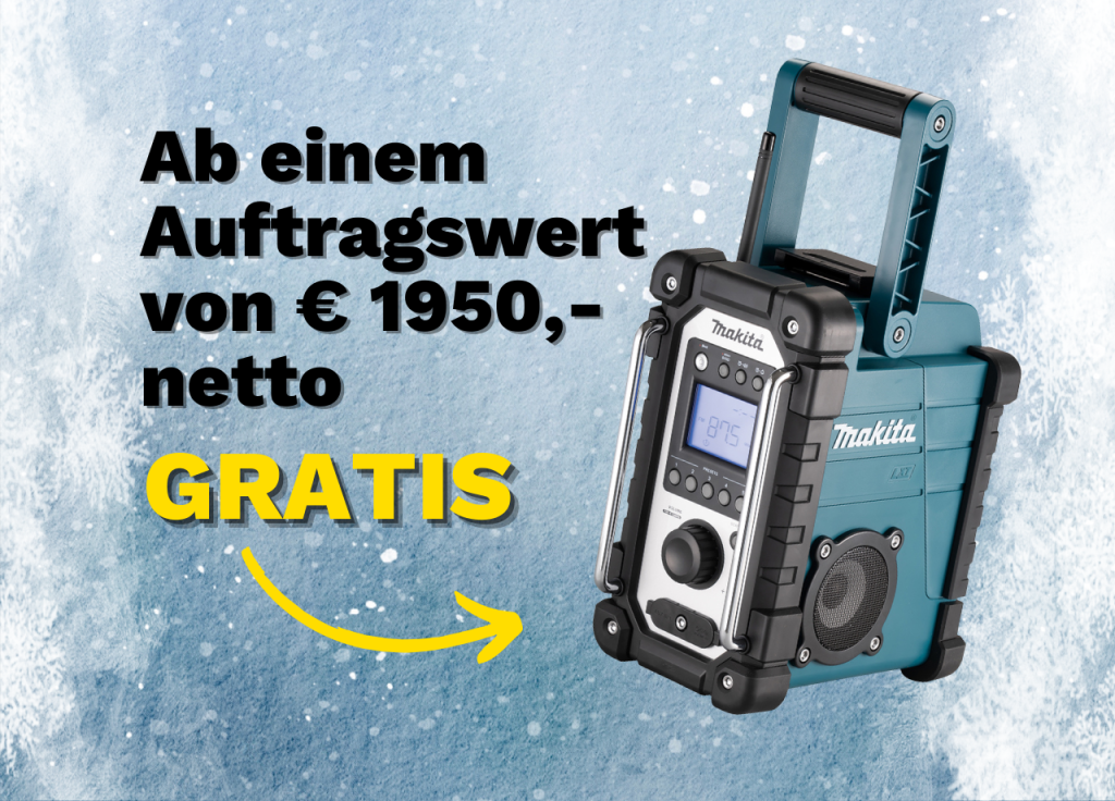 Ab einem Auftragswert von € 1.950,- netto gibt es das Makita Radio DMR116N Art.-Nr. 4091-023 GRATIS dazu.