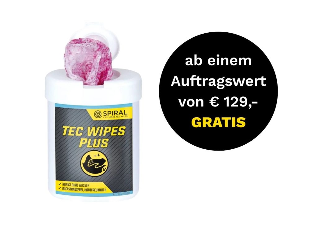 Ab einem Auftragswert von € 129,- netto erhalten Sie SPIRAL TecWipes Reinigungstücher 18 Stk. gratis zum Einkauf dazu.